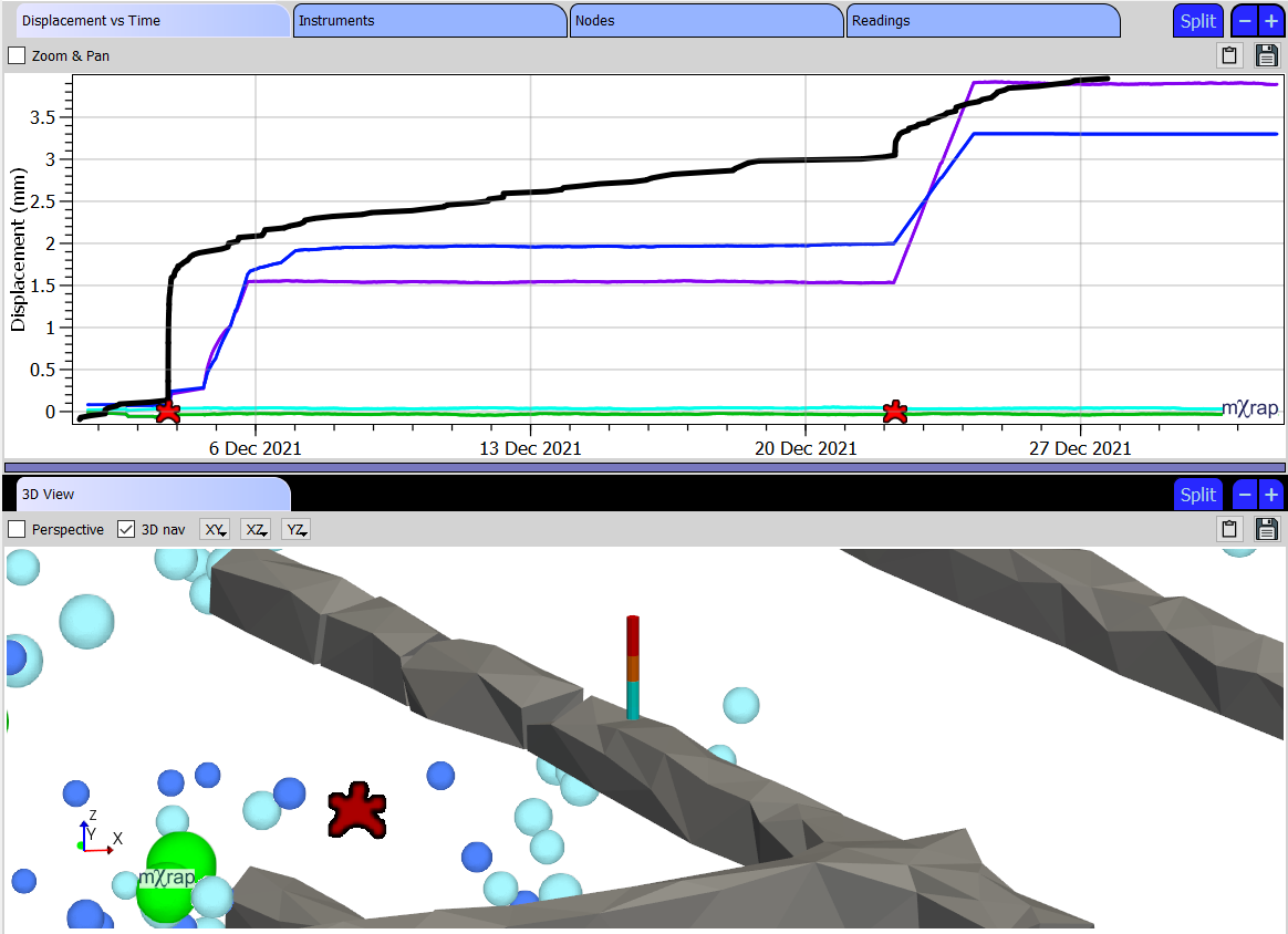 This app provides the tools to import and evaluate various formats of extensometer data.Data is assessed over the life of the instrument and for a period of interest.Displacement is expressed as a cumulative value over the instrument length and per node values.Instruments are plotted in 3D with markers displaying displacement measurement along with nearby seismic events and blasts.Cumulative and per node displacement values are charted over time and summarised in tables.