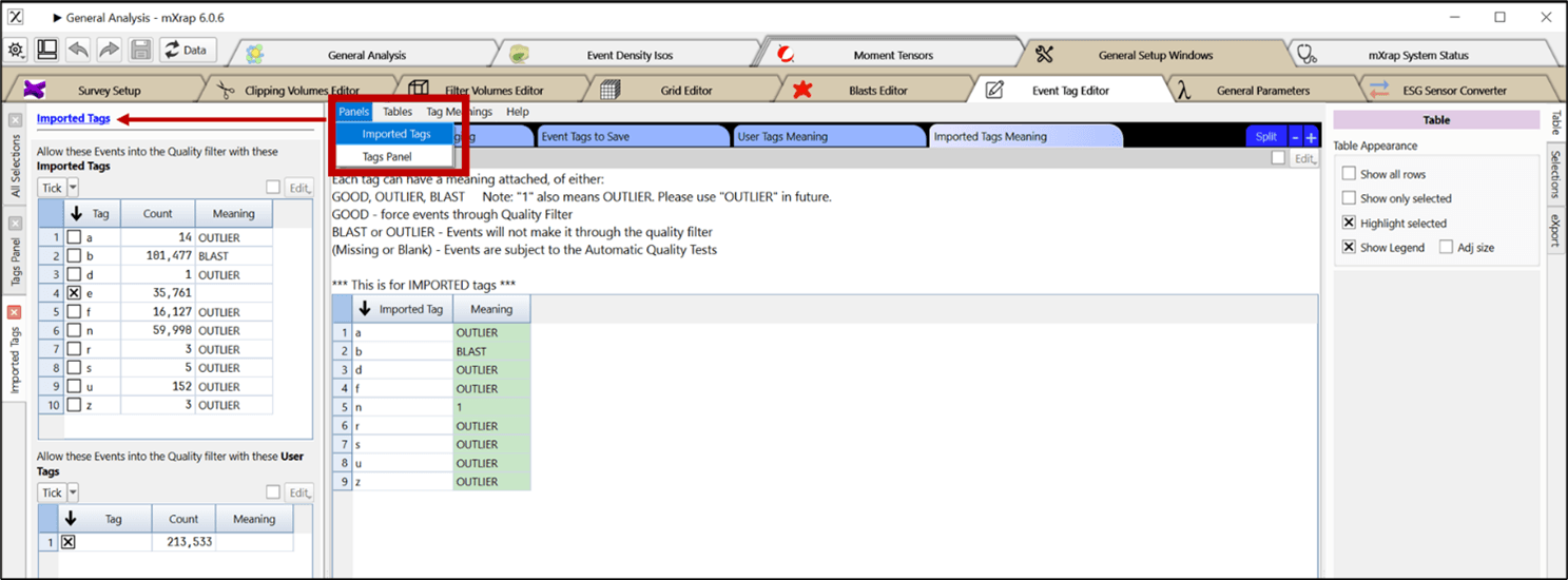 Event tags can be used to group events into categories. Example tags might be 'suspected blast', 'damage occurred', 'suspect location', 'outlier' or 'likely crusher noise'. These tags can be used in event filters to quickly show or hide particular categories.
