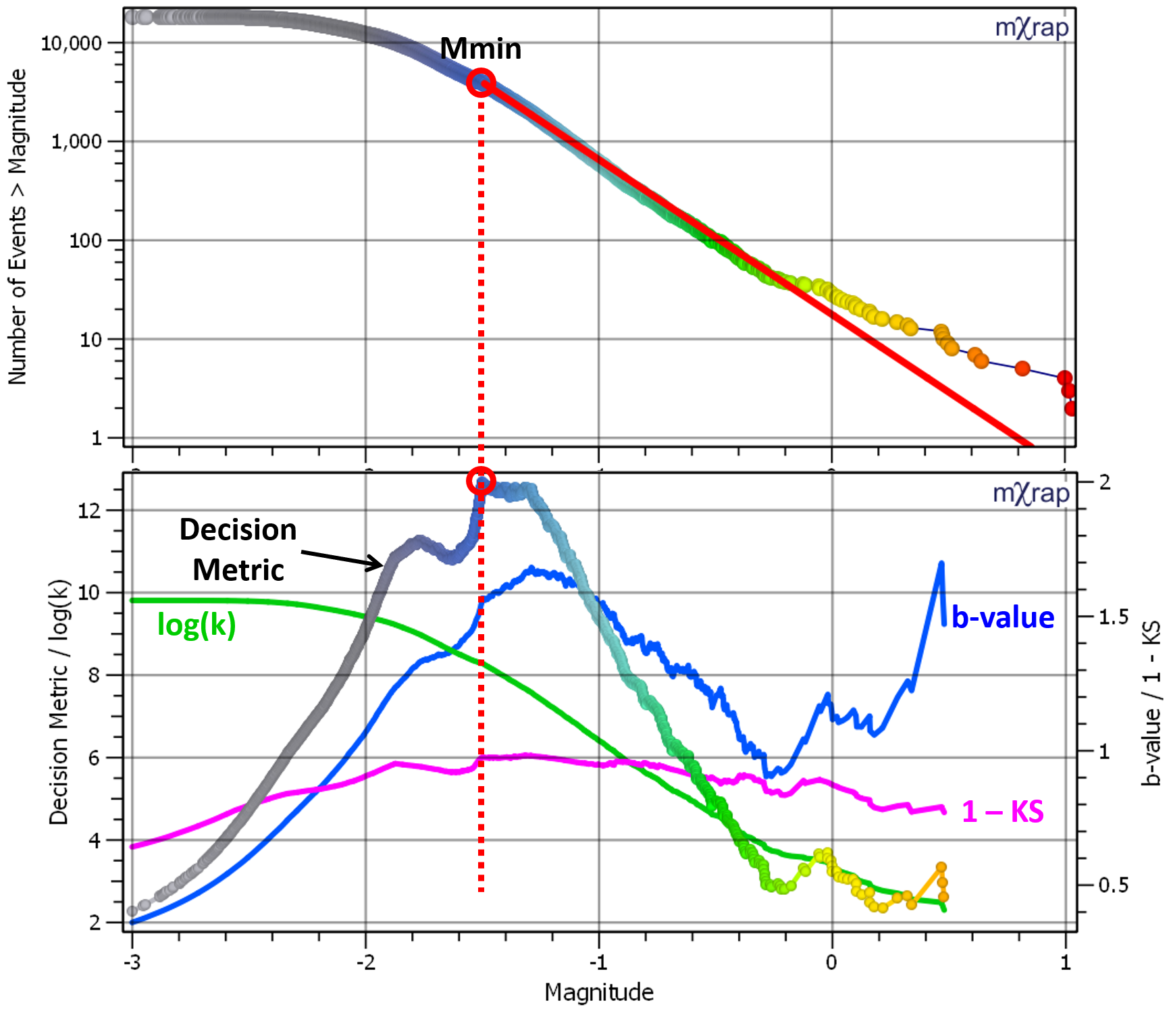 • b. The b-value is part of the decision metric to avoid over-shooting the Mmin. Higher b-values are given more weight since underestimating Mmin would result in a lower b-value.