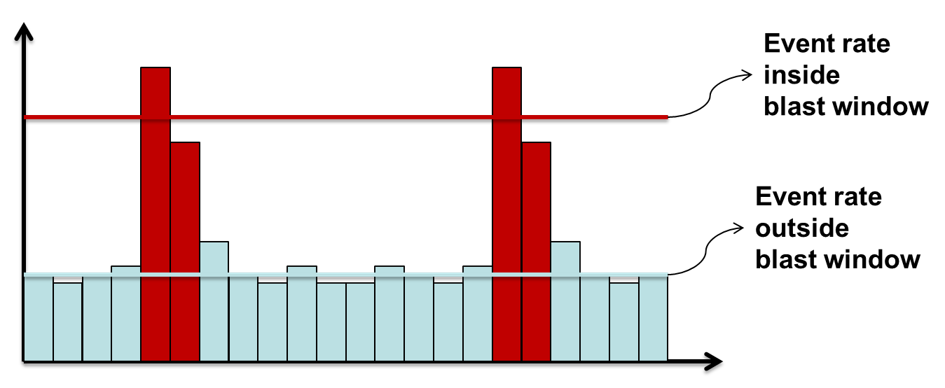 The response ratio for blasts and shift change is based on the event time of day. Blast and shift change periods are defined in General Setup Windows/Grid-based Analysis Settings. The response ratio is the activity rate inside the specified time-of-day periods divided by the activity rate outside those periods.