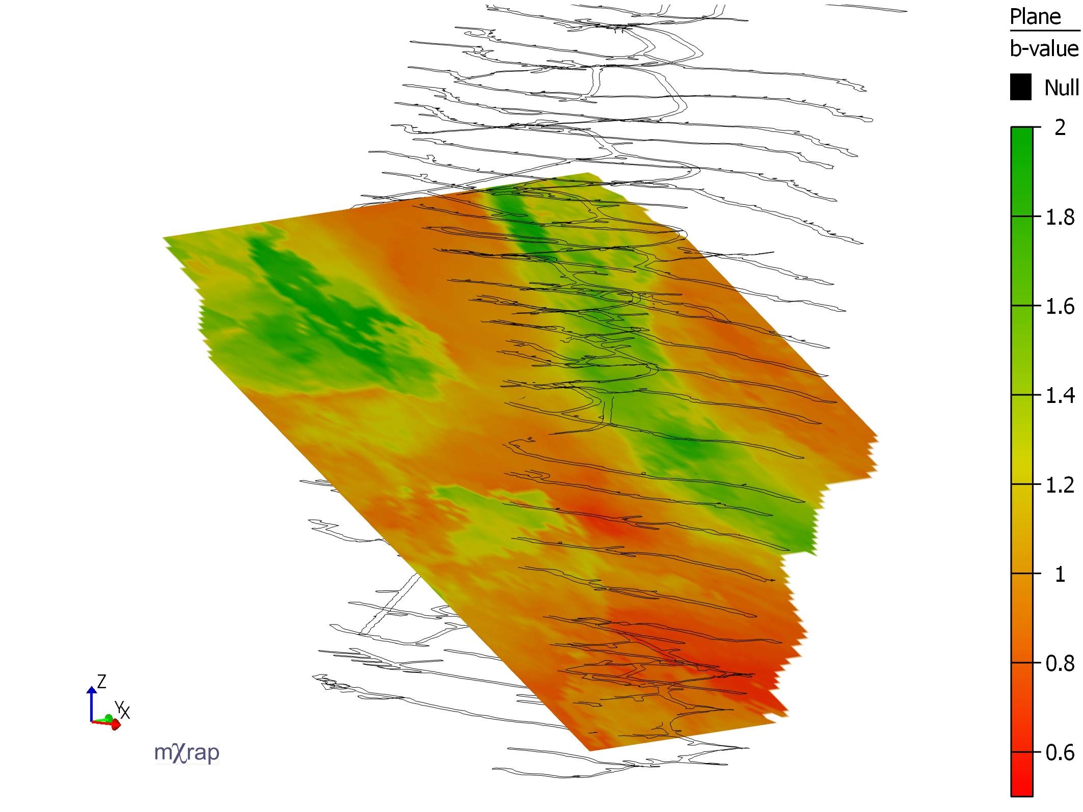Plane based analysis can be used to try to evaluate the change in seismic parameters along a fault plane, or simply to view changes in parameters easily as a slice. The plane can be dynamically overridden, allowing the user to 'sweep' through their mine.