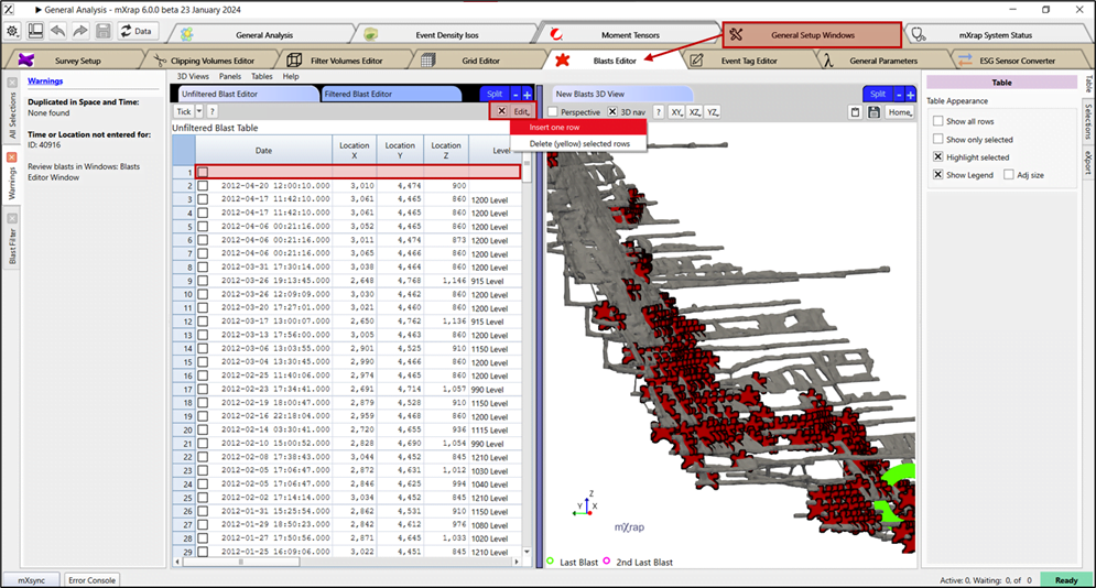 When trying to add, delete or change blasts in mXrap, best practice is to use the 'Blasts Editor' found under the 'General Set-Up Windows' tab