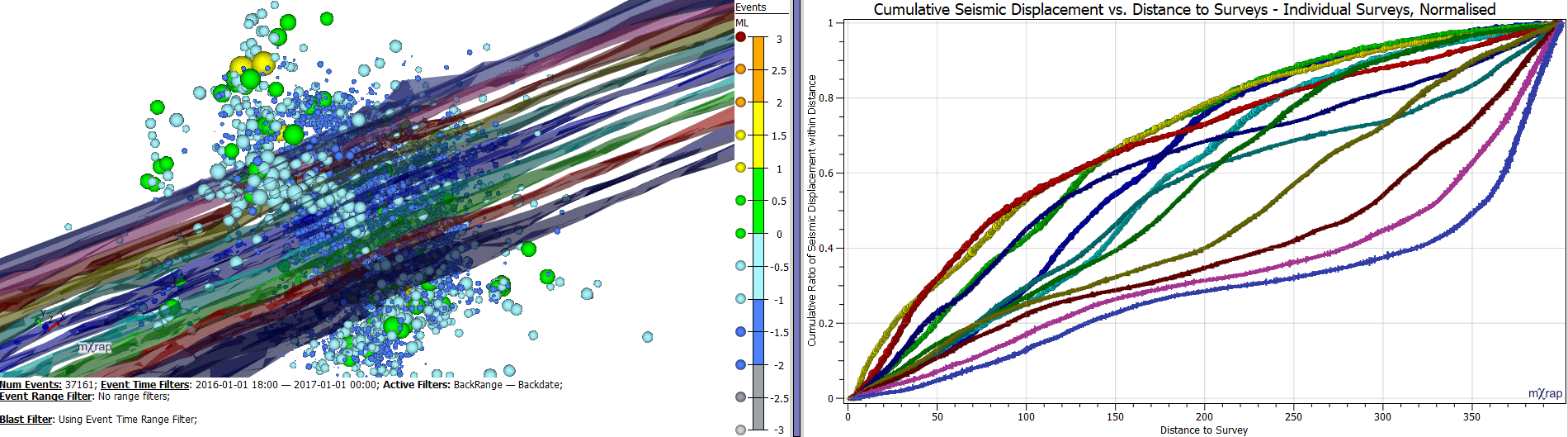The example below shows how you can compare your seismicity around your geological structures. Of course, sometimes a structure will have a lot of seismicity nearby because you happen to do a lot of blasting nearby. You can also plot blasts as a function of distance to survey!