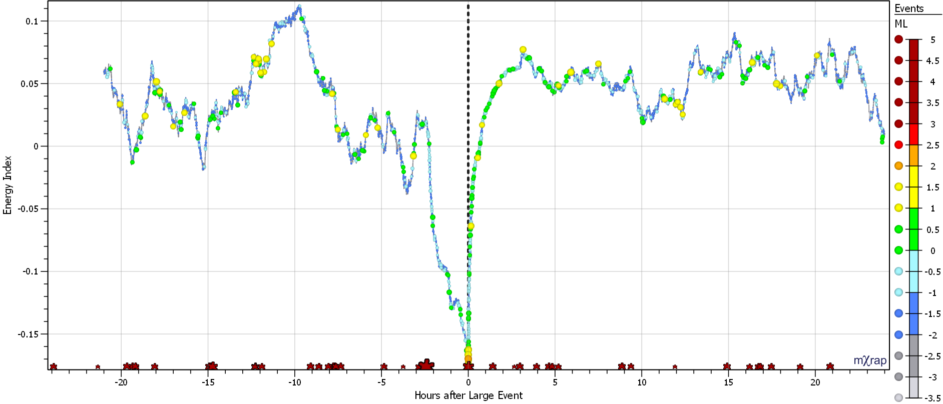 The chart below shows the energy index of seismicity for 24 hours before and after 156 large events. The time of the large event is indicated by a vertical, dotted black line. If a large event had a blast or another large event in the previous two hours, it was not included. The time of the most recent blast and large event, within the spheroid volume, is listed in the table to be excluded from the analysis if required.