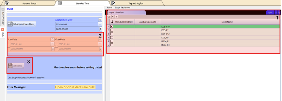 This window contains utilities which allow the user to edit some per stope parameters. It also allows the user to assign stope tags
