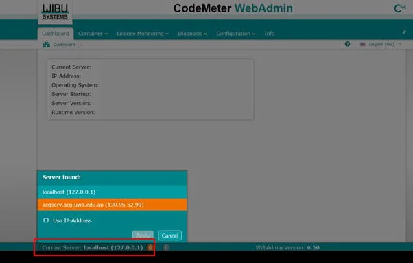 1. Your web browser should open to the CodeMeter WebAdmin page (you may get a message saying the website is not secure, proceed to the page). Ensure you are connected to the server which your silver codemeter dongle is plugged into, by clicking the server on the bottom left and selecting the correct one, then clicking Apply.
