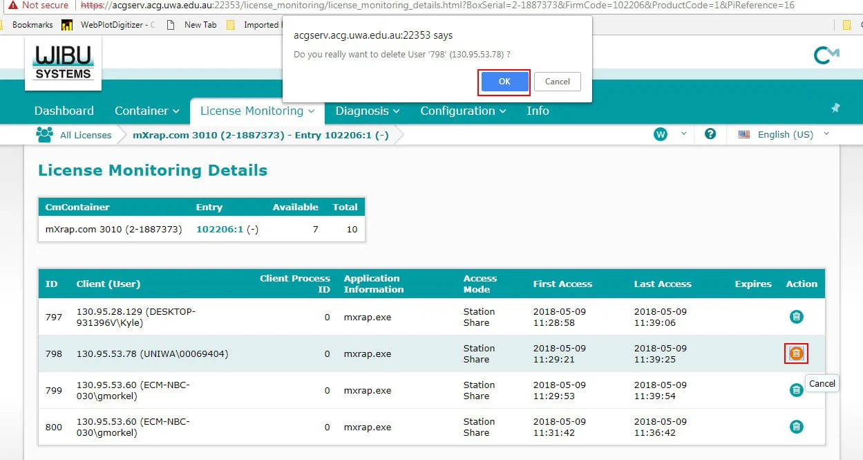 You can see who is using the licences on the left and you can remove them by clicking the trash can icon on the right, and clicking OK when the dialog box appears.