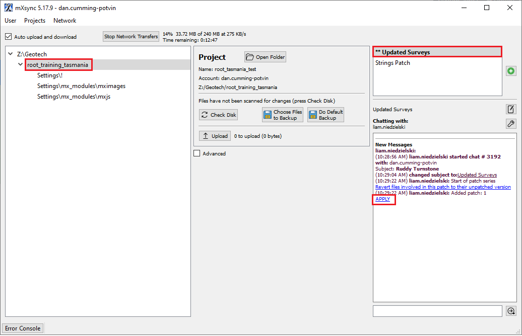 Clique em sua pasta raiz e procure à direita pelo chat apropriado (o membro da equipe mXrap que o informou sobre o patch deve ter dito o nome do chat). Clique no nome do chat e você deverá ver algum texto abaixo. Clique no último link do botão APPLY azul.