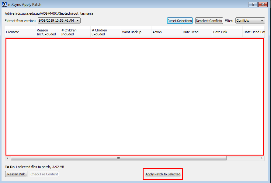 A janela 'mXsync Apply Patch' deve aparecer. Altere o Filtro no canto superior direito para Conflicts.