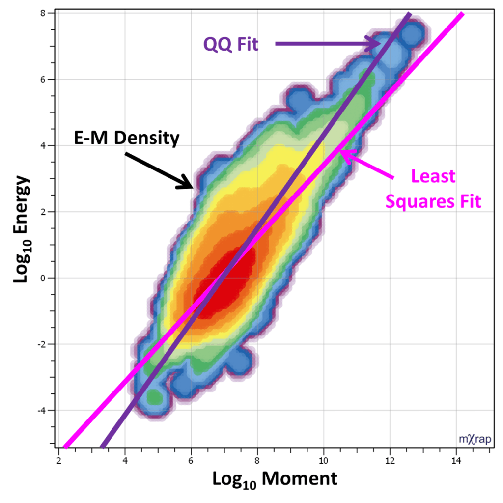The most common method of fitting a linear relationship between two variables is known as least squares regression (LSR). This method essentially minimizes the vertical (Y-axis) difference between the data points and the line of best fit. For the energy-moment case, this would be minimising the energy difference. LSR is designed for cases where the independent variable (X-axis) is known perfectly (zero error) and the error is only associated with the dependent variable (Y-axis). This is not suitable for the energy-moment case as there is uncertainty in both the energy and moment parameters. The uncertainty in moment and the uncertainty in energy are also generally not the same scale.