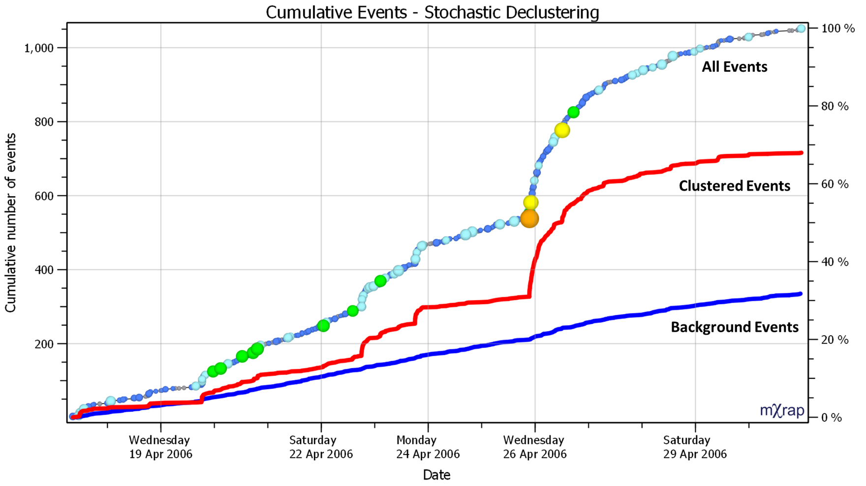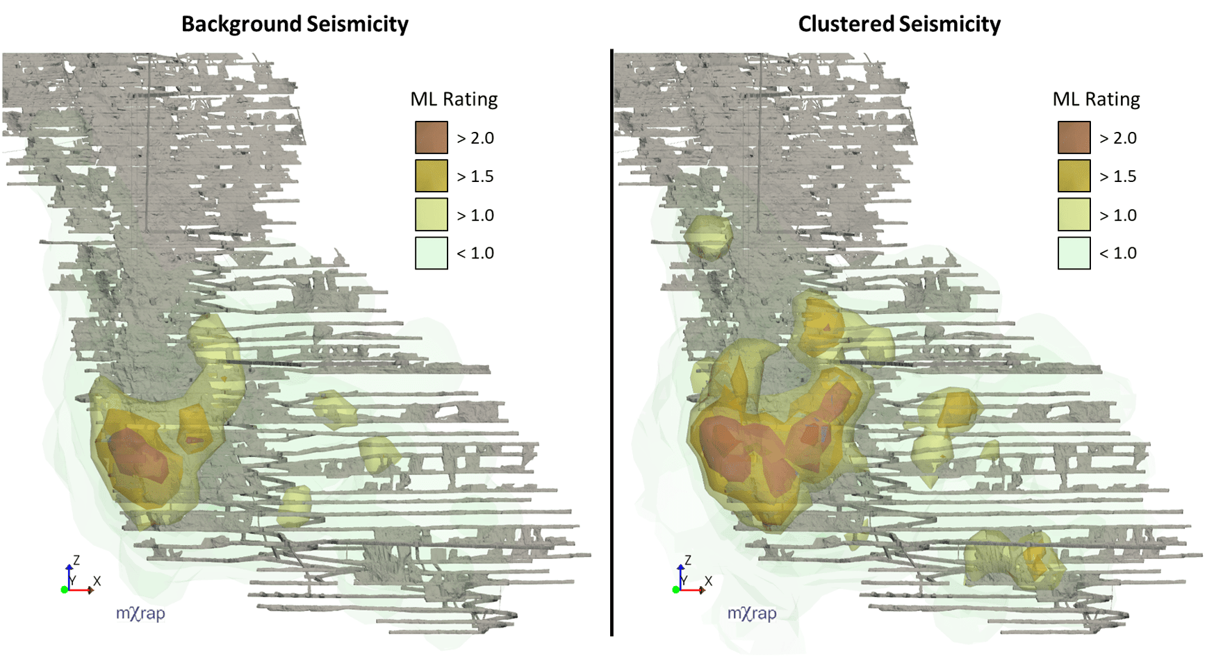 A stochastic declustering algorithm has been implemented in mXrap to separate events into 'clustered' and 'background' components. It can be useful when designing seismic exclusions and re-entry procedures to separate seismicity that occurs in short bursts from seismicity that has low variability in space and time. Short-term exclusions cannot be used to manage the risk associated with background seismicity, since the hazard inside a potential exclusion would be the same as outside the exclusion. Efficient exclusion and re-entry procedures target areas where seismicity is most clustered and where the seismic hazard to which people are exposed can be reduced with a short disruption to production.