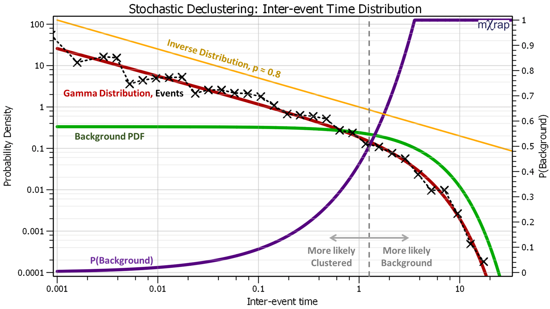 The declustering method was described by van Stiphout et al. (2012)3. The probability that an event is part of the background (purple line) is calculated based on the inter-event time and the ratio between the background and gamma PDF's. Events with small inter-event times are more likely to be clustered events. Events with large inter-event times are more likely to be background events.